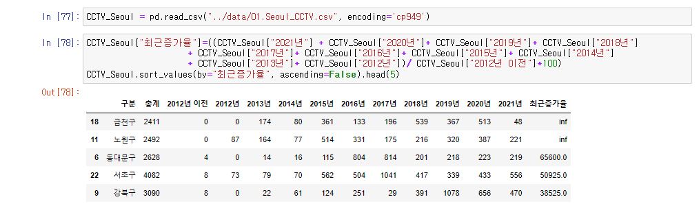 CCTV_Seoul.sort_values(by="최근증가율", ascending=False).head(5)'데이터 분석 > EDA_웹크롤링_파이썬프로그래밍' 카테고리의 다른 글