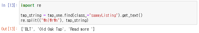13. 가게 이름과 메뉴는 re 모듈의 split으로 쉽게 구분할 수 있다.