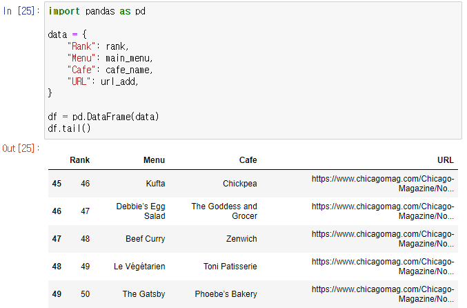 df = pd.DataFrame(data, columns=["Rank", "Cafe", "Menu", "URL"])