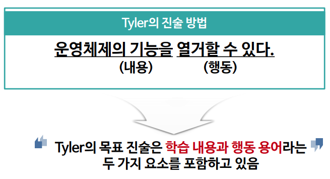 - Tyler의 목표 진술 방법은 교육에서 다루는 내용 영역과 학생들의 행동 형태가 동시에 표시되어야 함