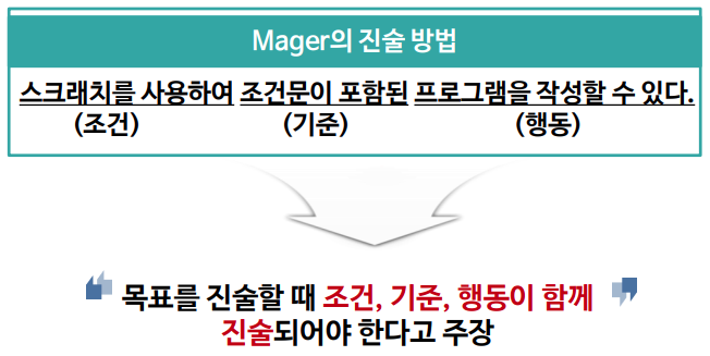 '학생이 학생 성취 행동을 보일 때 어떤 행동을 보일 것인지, 교사가 그것을 어떻게 알 수 있을지’를 반드시 진술해야 하기 때문에 다음의 조건 3가지를 제시
