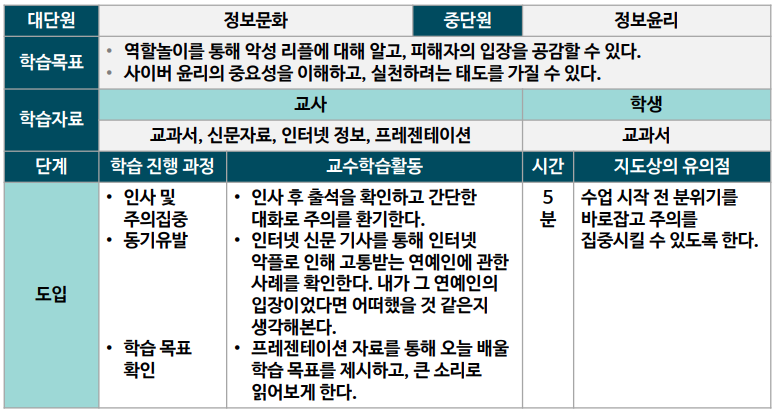 예시 [역할놀이를 적용한 중학교 정보 교과의 교수학습 과정안]
