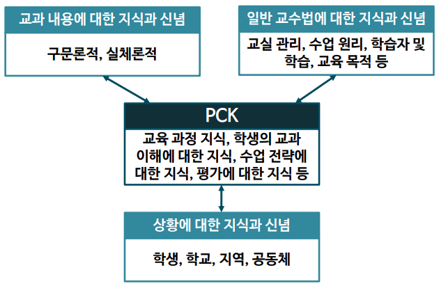 - 학생들이 학습을 실행할 때 나타나는 과정과 현상, 평가, 학급 경영과 관리 등의 제반 지식 포함