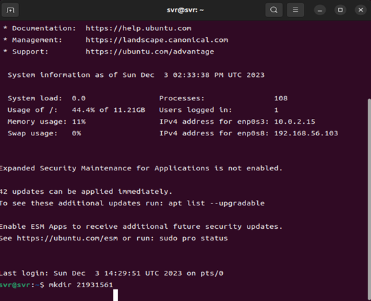 ⑩ 클라이언트PC 터미널에 공격문 mkdir 21931561이 입력됨