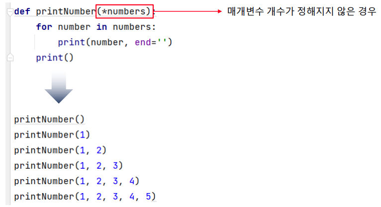 - 매개변수 개수가 정해지지 않은 경우 '*'를 이용한다.