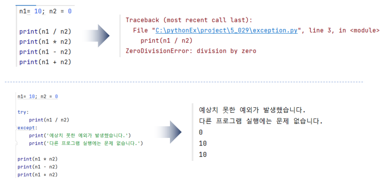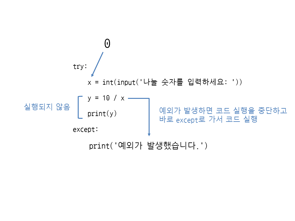 숫자를 0으로 나누면 ZeroDivisionError 예외가 발생한다. 여기서는 except에서 예외 처리를 하도록 만들었으므로 '예외가 발생했습니다.'가 출력된다.