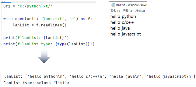 파일의 모든 데이터를 읽어서 리스트 형태로 반환한다.