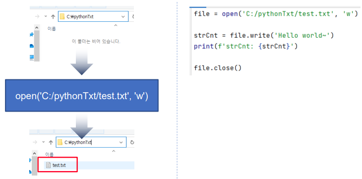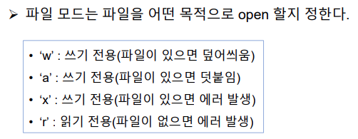 - 'x' : 파일이 없으면 파일을 생성하고 쓰기모드로 열립니다. 만약 파일이 있으면 에러를 발생시킨다.