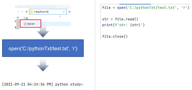 - 'r' : 기본값으로 정해져 있으며 파일을 읽기 위한 옵션. 파일이 없으면 에러가 발생한다.