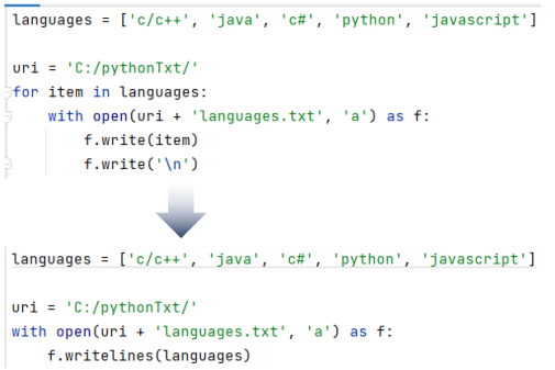 writelines()는 리스트(List) 또는 튜플 데이터를 파일에 쓰기 위한 함수이다.