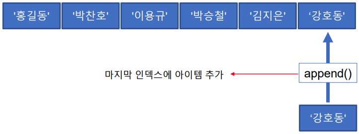 append() 함수를 이용하면 마지막 인덱스에 아이템을 추가할 수 있다.