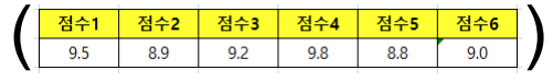 튜플로 정의된 점수표에서 최저 및 최고 점수를 삭제한 후 총점과 평균을 출력해 보자.