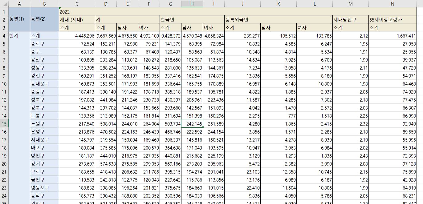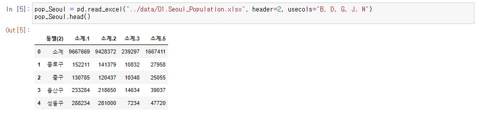 pop_Seoul = pd.read_excel("../data/01.Seoul_Population.xlsx", header=2, usecols="B, D, G, J, N")
