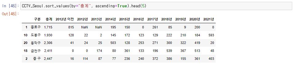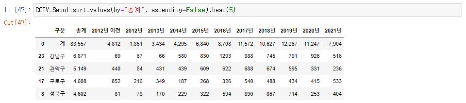CCTV_Seoul.sort_values(by="최근증가율", ascending=False).head(5)'데이터 분석 > EDA_웹크롤링_파이썬프로그래밍' 카테고리의 다른 글