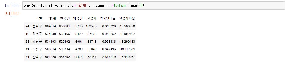 pop_Seoul.sort_values(by="합계", ascending=False).head(5)