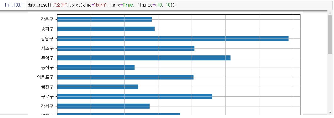 data_result["소계"].plot(kind="barh", grid=True, figsize=(10, 10));