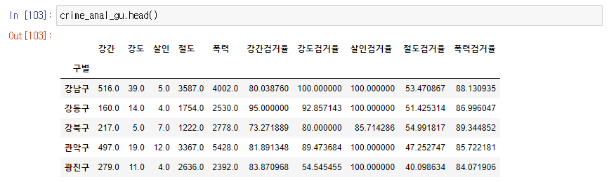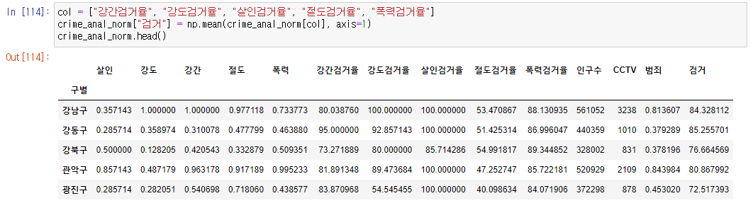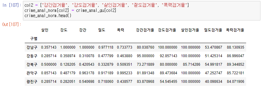 col = ["강간검거율", "강도검거율", "살인검거율", "절도검거율", "폭력검거율"]