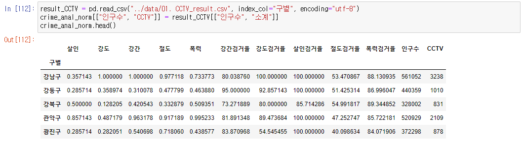 crime_anal_norm[["인구수", "CCTV"]] = result_CCTV[["인구수", "소계"]]