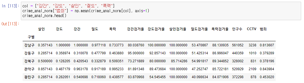 crime_anal_norm["범죄"] = np.mean(crime_anal_norm[col], axis=1)