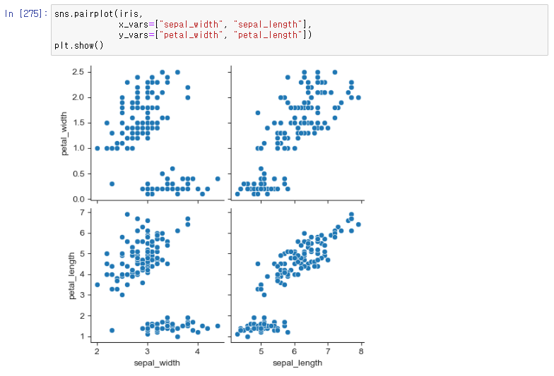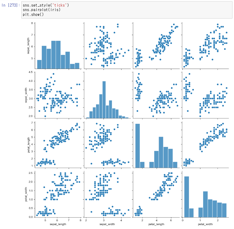 3차원 이상의 데이터라면 pairplot 함수를 사용해 분포도를 그립니다.