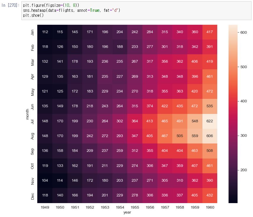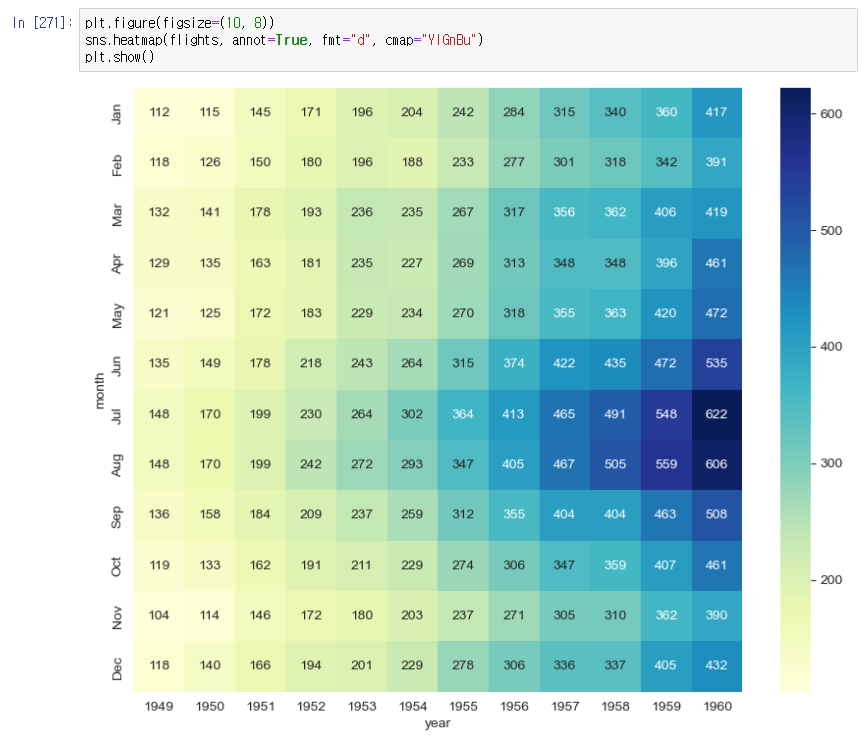- heatmap을 사용하면 두 개의 카테고리 값에 대한 값 변화를 한 눈에 알기 쉽다.