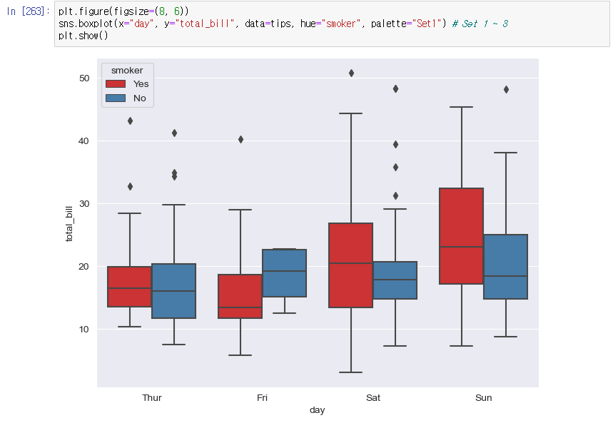 sns.boxplot(x="day", y="total_bill", data=tips, hue="smoker", palette="Set1") # Set 1 ~ 3