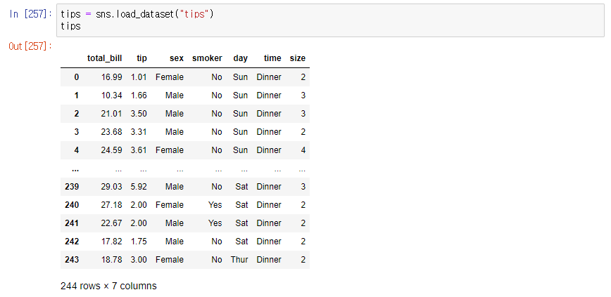 - seaborn에는 실습용 데이터가 몇 개 내장되어 있다.
