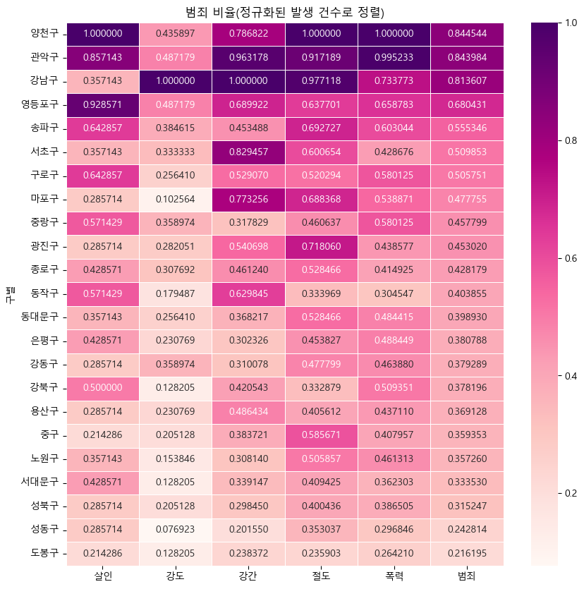 plt.title("범죄 비율(정규화된 발생 건수로 정렬)")