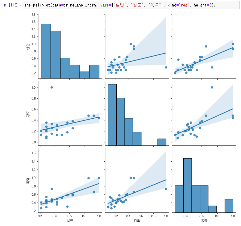 3. pairplot으로 강도, 살인, 폭력에 대한 상관관계를 확인해보자.