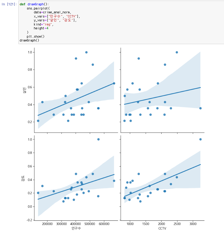 4. 인구수, CCTV와 살인, 강도와의 관계 확인