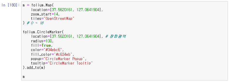 - folium을 사용하여 인터랙티브한 지도를 생성하고 마커를 추가하여 시각화하거나 원으로 범위를 표기하고 html 파일로 내보내기 등을 수행할 수 있다.