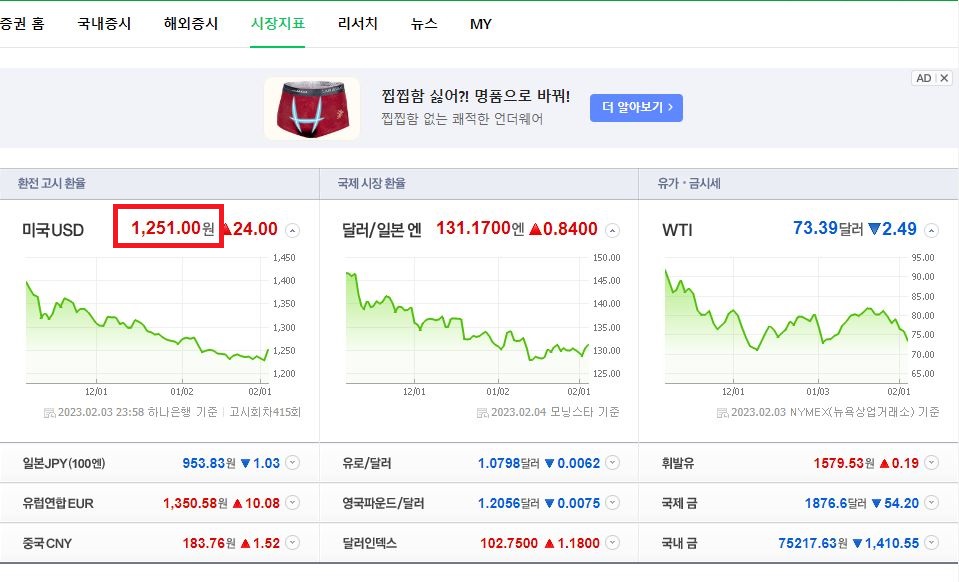 환전 고시 환율 2023.02.03 23:58 하나은행 기준 고시회차 415회