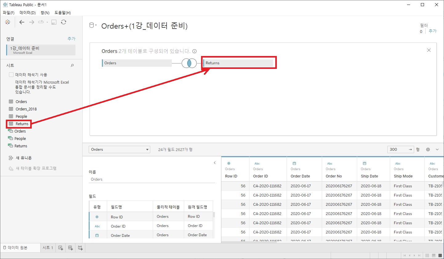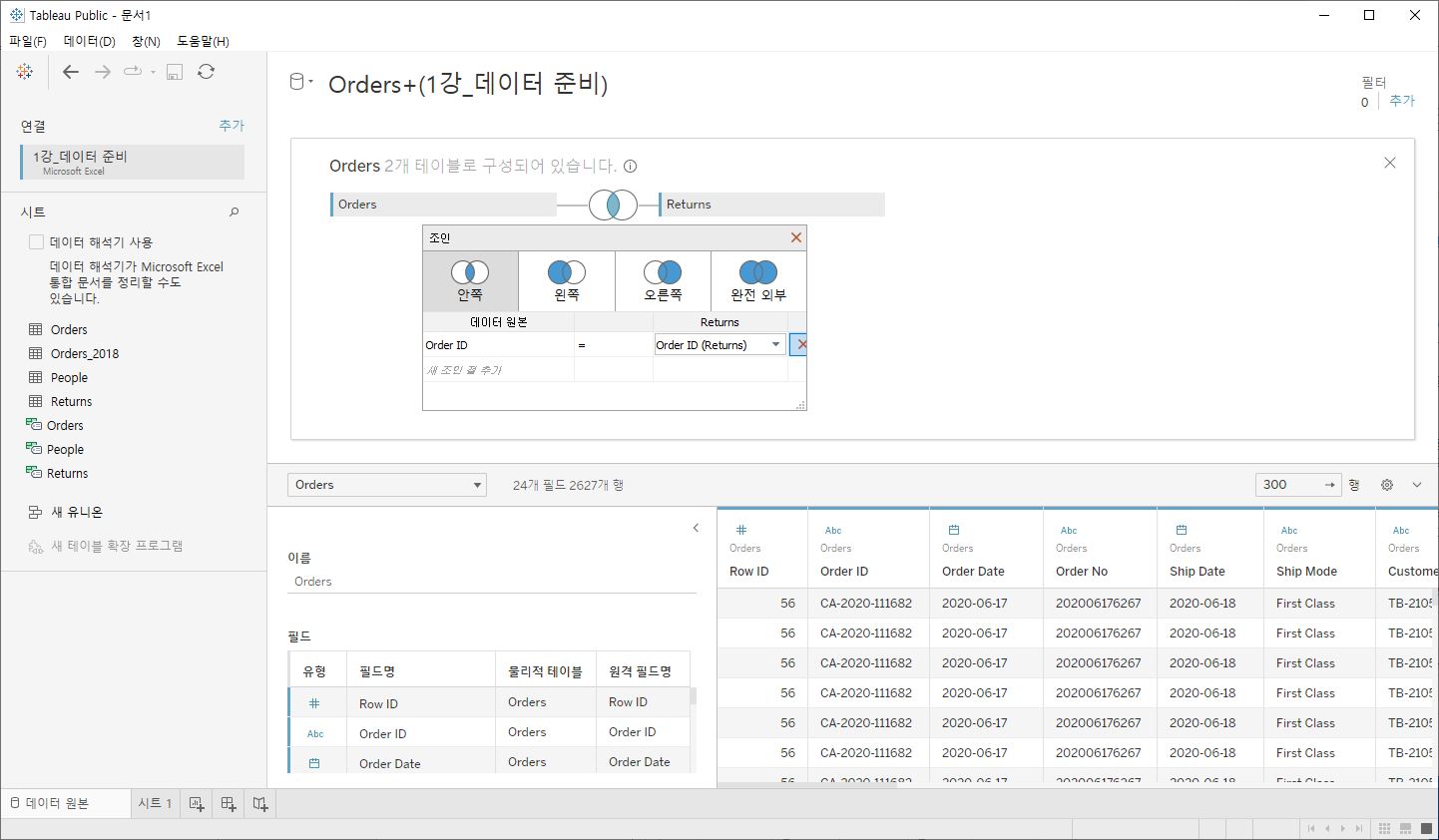 Returns 시트를 드래그해서 Orders의 오른쪽에 가져다 놓으면 다이어그램이 표시되고 자동으로 Inner 조인으로 연결한다.