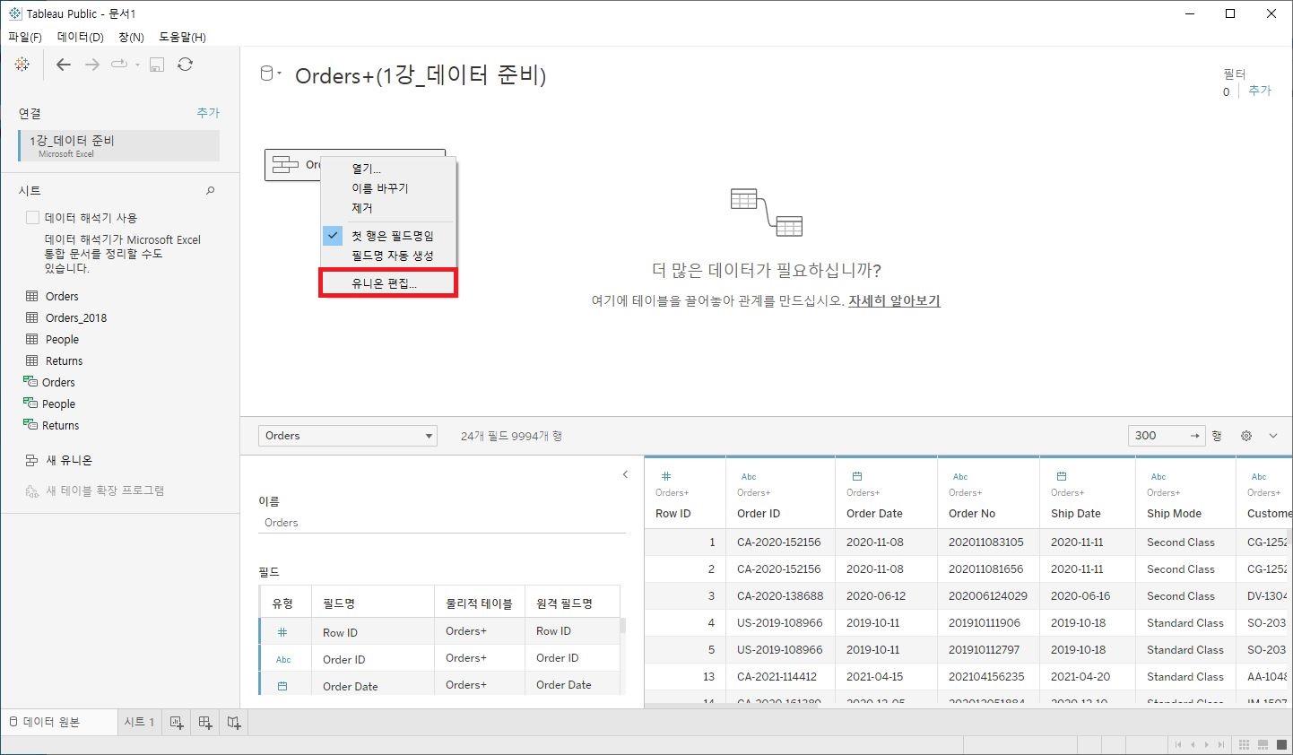 현재 테이블에서 마우스 우클릭 유니온 편집을 클릭하면 어떤 테이블이 유니온 되었는지 확인할 수 있다.