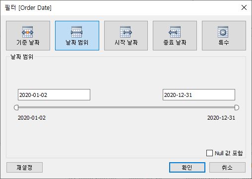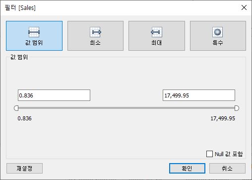5. Sales는 숫자(실수) 타입이므로 숫자의 범위를 선택하는 필터를 이용할 수도 있다.