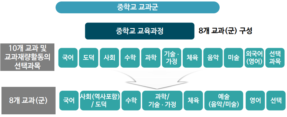 교과군과 학년군 도입 : 집중이수제로 학기당 이수 과목을 10~13과목에서 8과목 이하로 축소