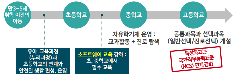 - 초등 5~6학년 ‘실과’와 중학교, 고등학교의 ‘정보’ 교과를 소프트웨어 교육 중심으로 개편
