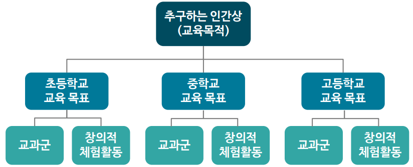 교육부에서 고시한 교육과정에는 우리나라 교육의 목적과 초 ∙ 중 ∙ 고등학교의 학교급별 목표, 각 교과의 교육 목표가 체계적으로 제시되어 있음