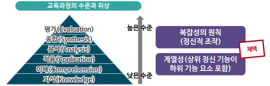 - Bloom은 지식 수준을 여섯 단계로 분류하고, 각 단계의 영역을 다시 세분화하여 여러 수준으로 분류해 나가는 방식 제안