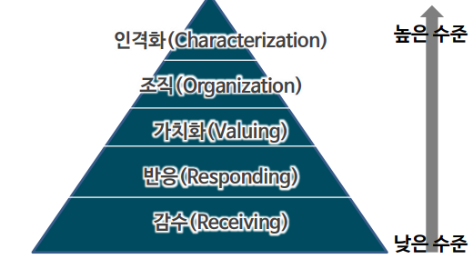 Krathwohl, Bloom & Masia는 정의적 행동 특성을 개인이 내면화 하는 정도에 따라 5단계로 구분(생태제, 2005)