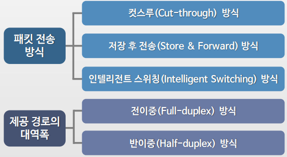 | 인텔리 전트 스위칭 방식 | 보통 컷스루 모드로 작동하다가 오류가 발생하면 저장 후 전송 모드로 자동 전환하여 오류 프레임 전송을 중지 오류율이 0이 되면 자동으로 다시 컷스루 방식으로 전환 |