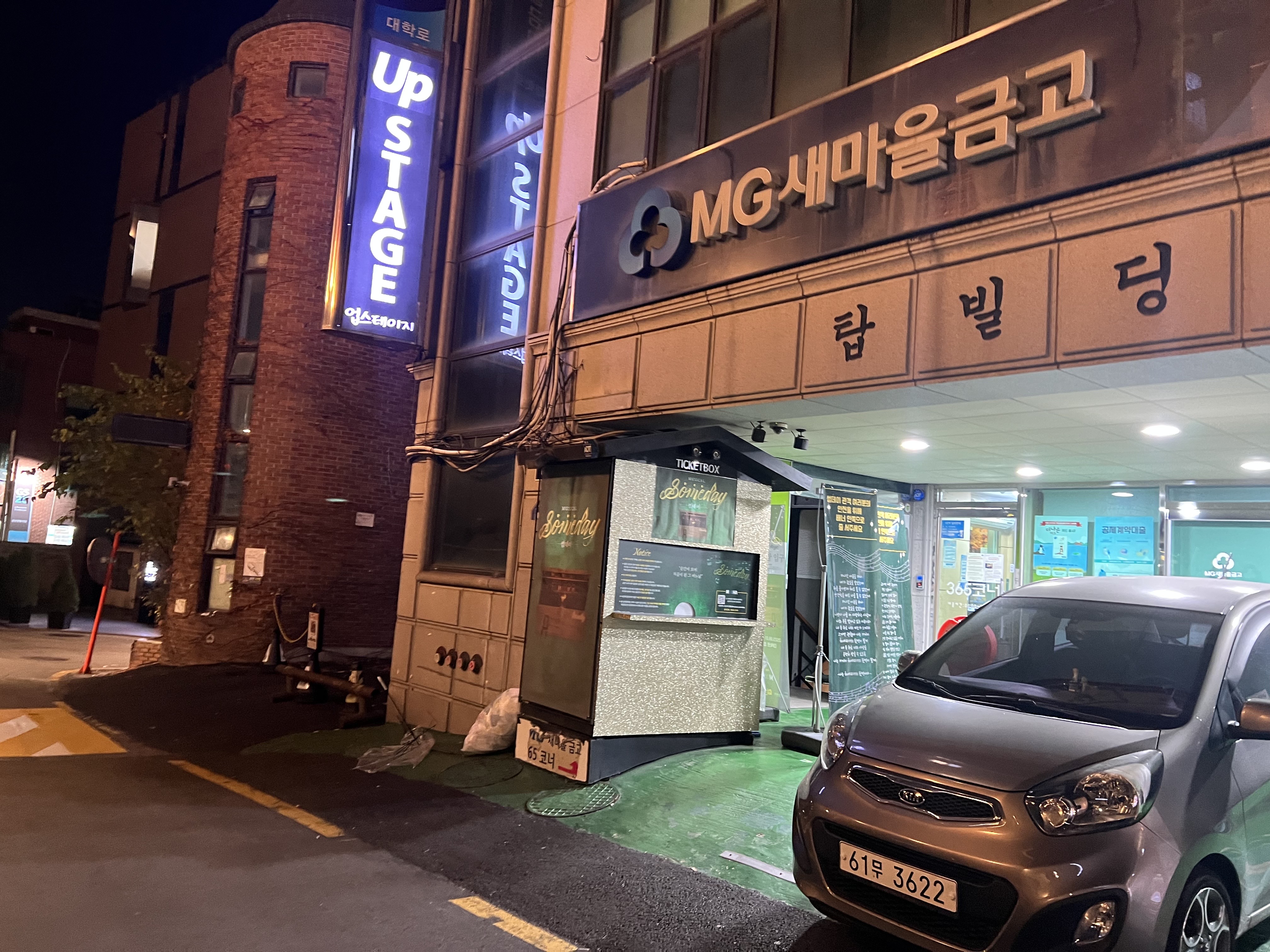 새마을 금고 건물 앞에 보이는 티켓박스!