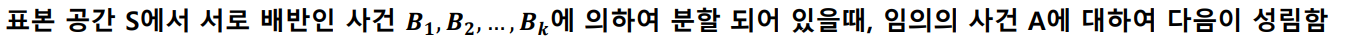 | 배반사건(mutually exclusive event) 사건 A와 사건B가 동시에 일어날 수 없을 경우 A ∩ B = ∮ |