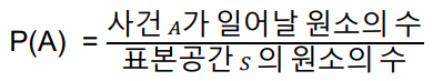 사건 A가 일어날 확률을 P(A)라고 하고, 표본 공간(S)가 유한집합일때 표본 공간의 모든 원소들이 일어날 확률이 같으면