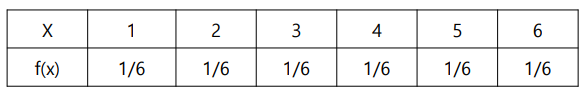 - 주사위를 한번 굴려서 나오는 숫자를 확률 변수 X라고 하면, 확률 변수 X는 아래와 같음