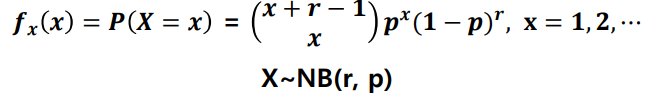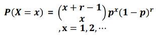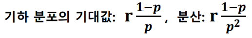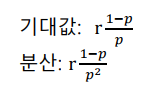 | 음이항분포 | 어떤 실험에서 성공확률이 p일 때, r번의 실패가 나올 때 까지 발생한 성공 횟수 X의 확률 분포 | ![]() |