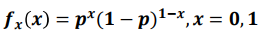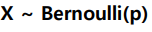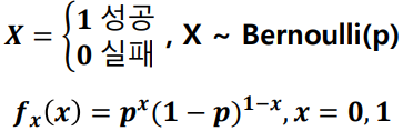 - 베르누이 시행에서 성공이 ‘1’, 실패가 ‘0’의 값을 갖을 때 확률 변수 X의 분포를 베르누이 분포(Bernoulli distribution)라고 하며 다음과 같이 정의함