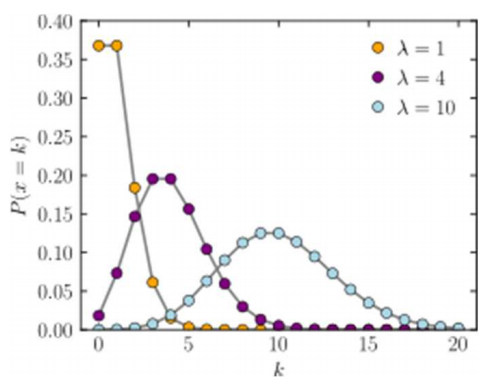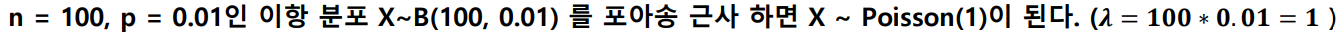 - 어느 희귀한 사건이 어떤 일정한 시간대에 특정한 사건이 발생할 확률 분포 임
