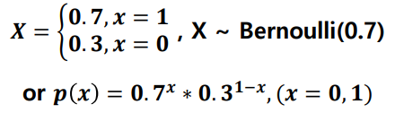 - 예제4.1) 파란공 7개, 빨간공 3개가 들어있는 주머니에서 공 하나를 뽑을 때, 파란공이면 성공 빨란공이라면 실패인 실험을 한다고 가정하자. 이때 베르누이 분포를 정의하면