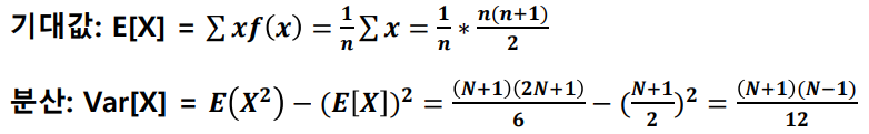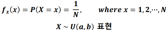 - 확률 변수 X가 유한개이고, 모든 확률 변수에 대하여 균일한 확률을 갖는 분포를 이산형 균등 분포라고 함